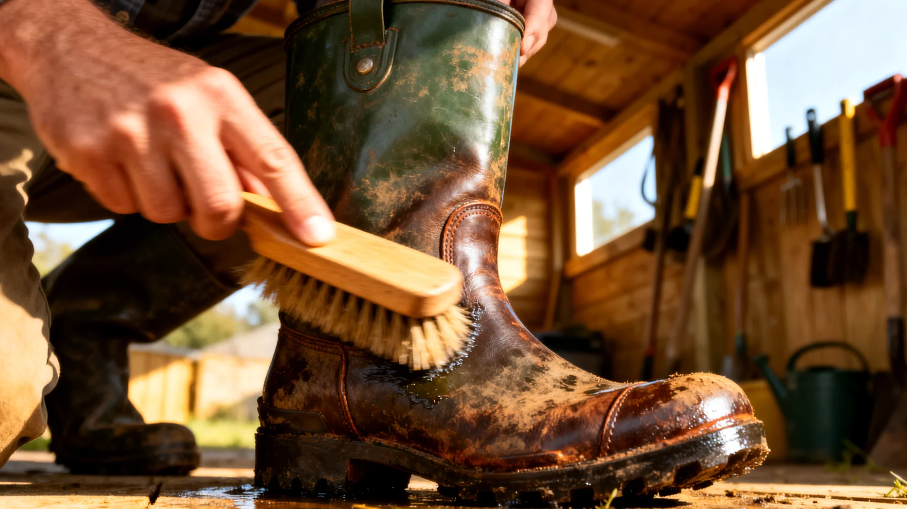 Tuinlaarzen in de garage als gereedschapshouder
